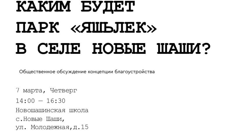 7 марта в 14:00-16:30 Новошашинская школа, с. Новые Шаши, ул. Молодежная, д.15. Приглашаем на обсуждение местных жителей, собственников и арендаторов земельных участков и зданий, расположенных поблизости, активистор и представителей местных сообществ, предпринимателей и всех, кому небезразлично будущее этого места. По итогам обсуждения концепция благоустройства будет доработана с учетом мнений участников встречи. Заранее ознакомиться с проектом можно на сайте: http://atnya.tatarstan.ru/rus/file/pub/pub_1779510.pdf