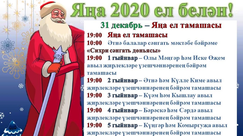 25 декабрьдә 17:00 дә районның үзәк чыршысы ачылу бәйрәме узачак. Бәйрәмдә төрле оешмалардан Кыш Бабайлар парады, аларның чыгышлары, күңелле уеннар, җырлар, биюләр булачак.