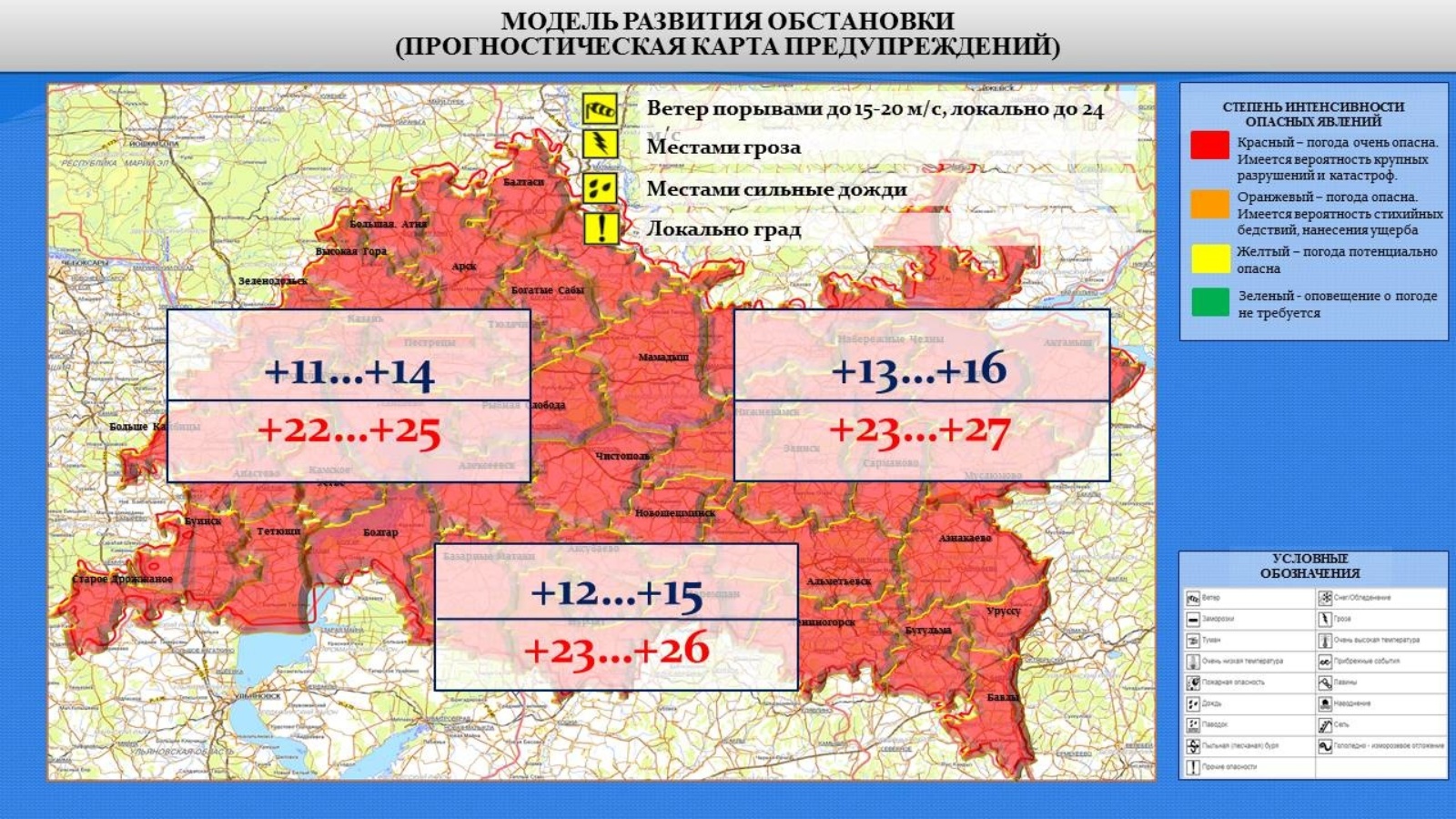 Татарстан Республикасы территориясендә 2022 елның 17 июнендә көндез һәм кич белән урыны белән яшенле яңгыр, көчле яңгыр, градус, җилнең тизлеге секундына 15-20 метр, урыны белән 24 метрга кадәр (Казан шәһәрендә – 15-20 метрга кадәр көчле җил белән яшен) көтелә.